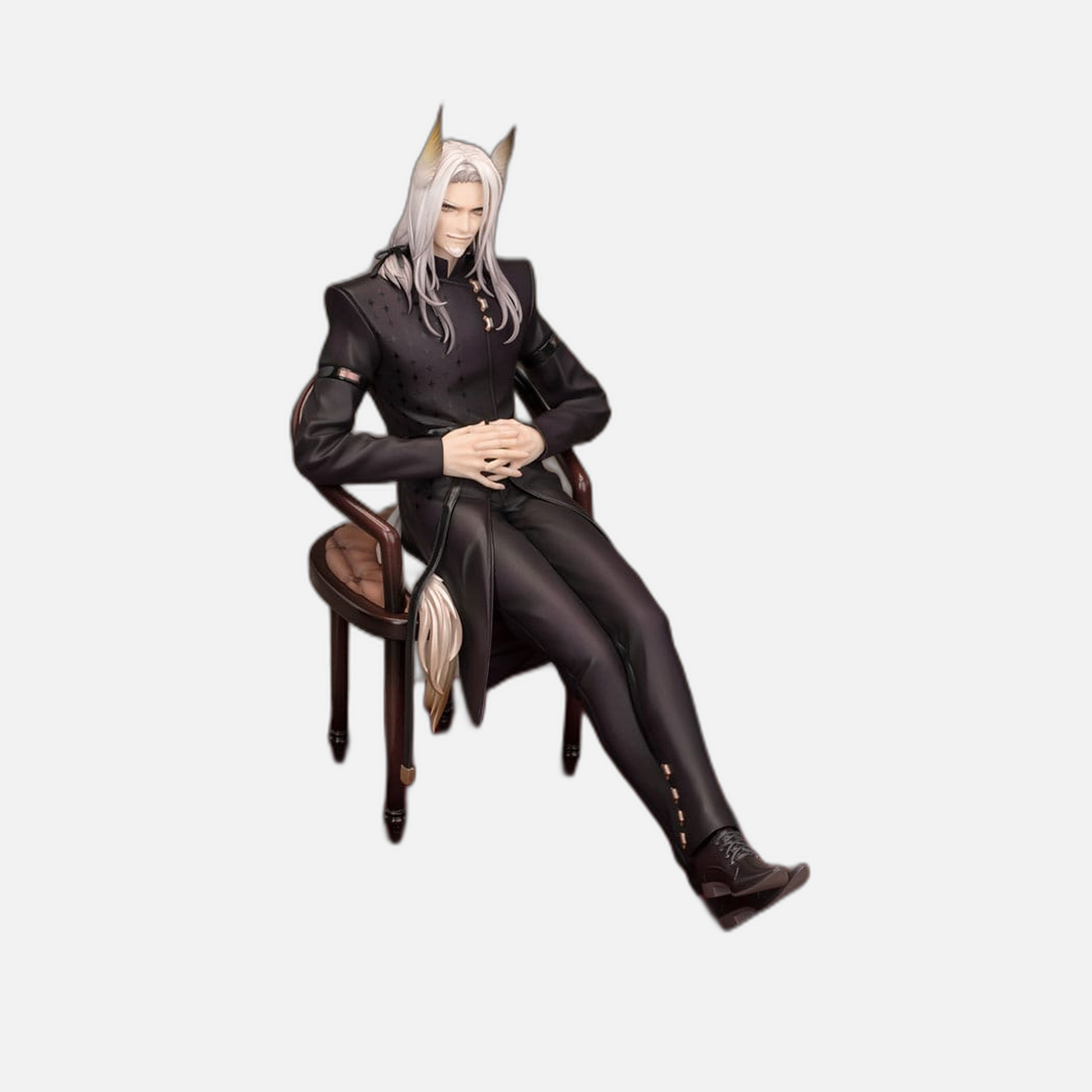 Introducing the Arknights PVC Statue of Hellagur in his stunning Formal Dress Ver., a breathtaking embodiment of elegance and power that effortlessly melds the worlds of anime and collectible artistry. This 1/7 scale figure captures Hellagur in a moment of serene grace as he kneels on a chair, his high-slit skirt artistically revealing his slender legs, inviting admiration from every angle. The minute details of his attire, including the flowing fabric and the intricate folds, are painstakingly crafted, showcasing the talent and dedication of the artists involved in its creation. Each curve and contour speaks to the sophistication of this formal design, making Hellagur a striking centerpiece for any collector’s display.