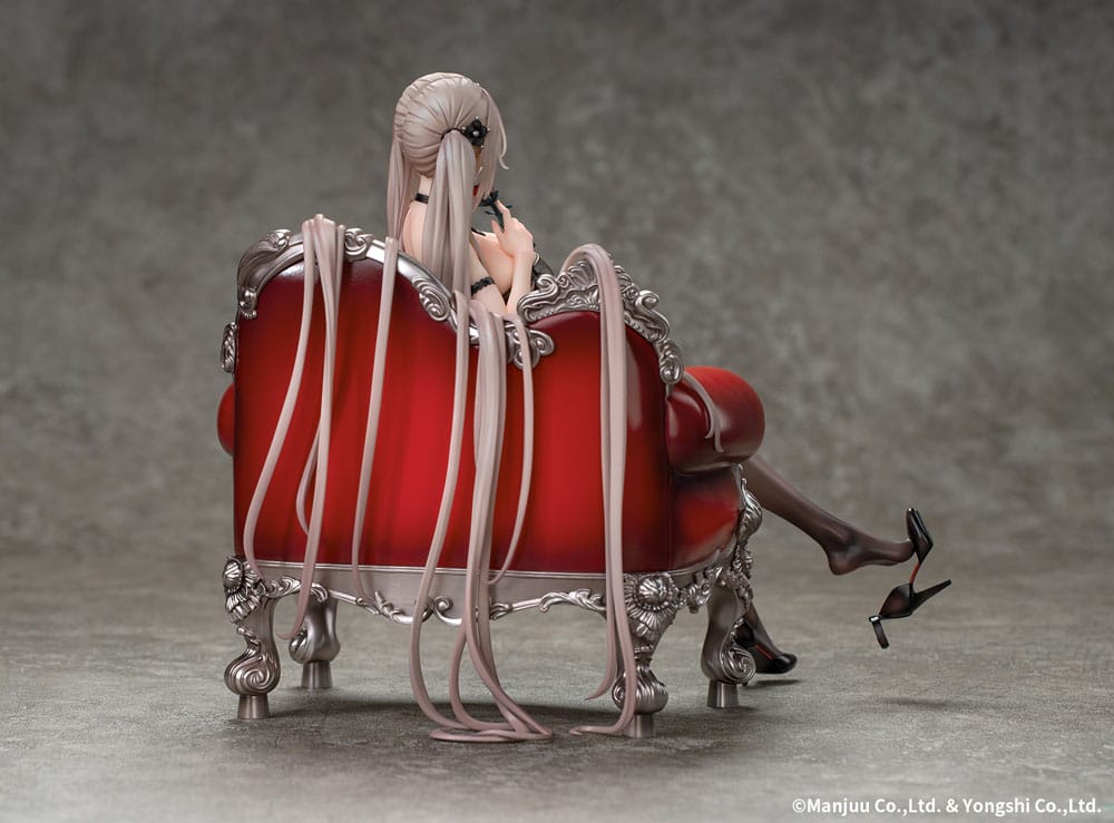 Step into the enchanting world of Azur Lane with the stunning "Formidable: Rose Ceremony Ver." PVC statue, a beautiful tribute to one of the beloved characters from the hit mobile game. This meticulously crafted 1/7 scale figure captures Formidable in a moment of grace and elegance, depicted in a captivating side pose that showcases her flowing hair and alluring presence. Dressed in a striking black evening gown, every ruffle and contour is expertly detailed, emphasizing her perfect figure and the soft curves that make her such a memorable character. The delicate addition of semi-transparent stockings adds a touch of allure, allowing you to appreciate the artistry of her design from every angle.
