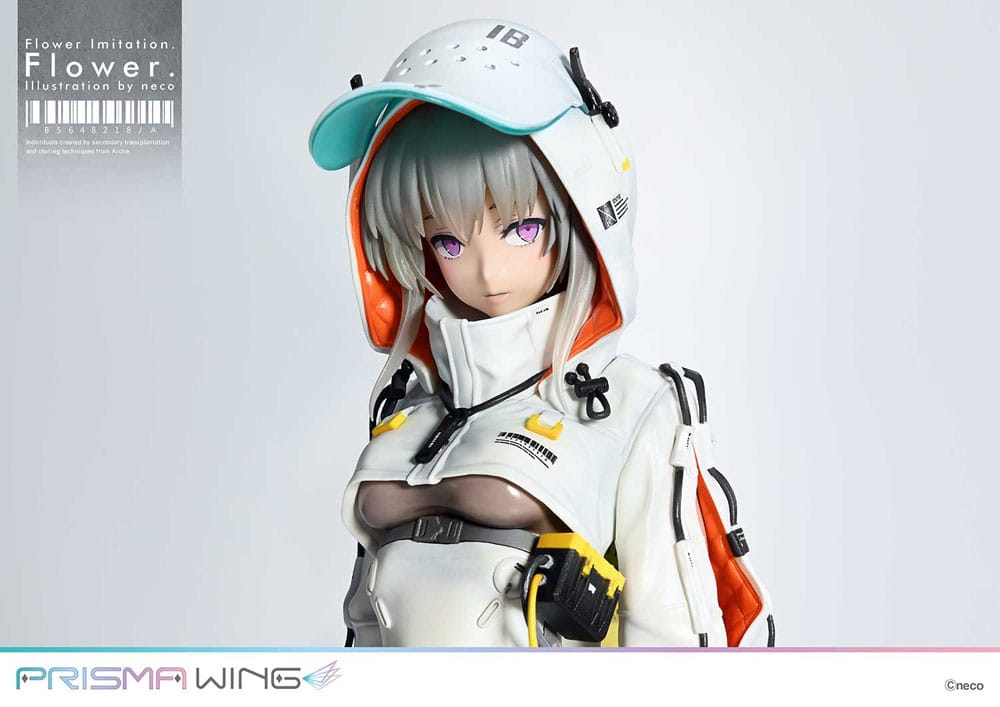 Step into a vivid, dystopian world where artistry and emotion intertwine with nature and technology through the Flower Imitation Prisma Wing PVC Statue, meticulously crafted by the renowned illustrator, neco. This stunning 1/7 scale statue brings to life a captivating figure whose presence is both striking and enigmatic. The intricate gaze that peers through her visor and mask exudes a chic sophistication, beautifully capturing the essence of neco's unique aesthetic. Her ash-gray hair cascades gracefully, contrasting against her luminous skin, while the innovative color palette of her post-futuristic attire breathes life into this vividly imagined future.