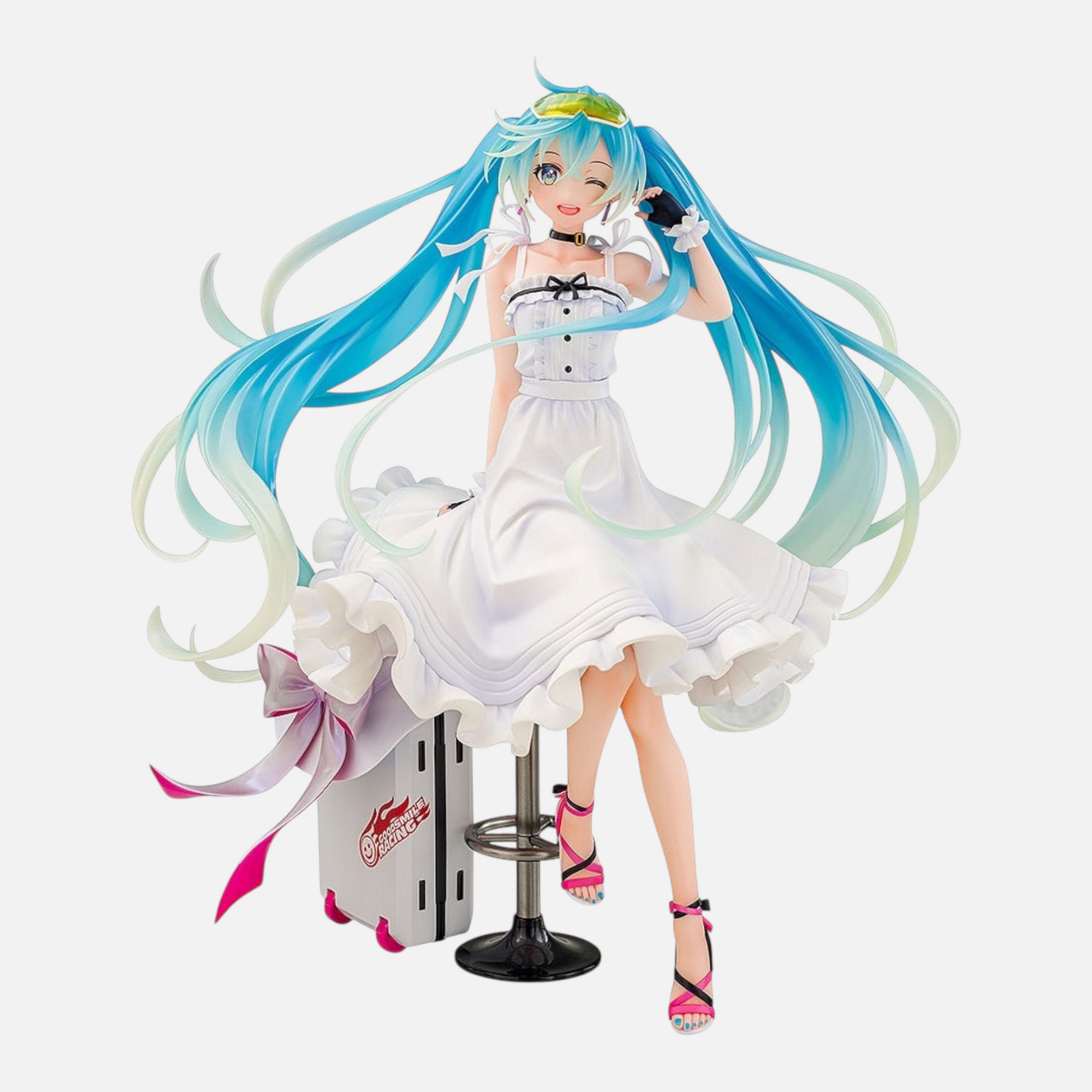 Featuring a uniquely styled costume packed neatly in her suitcase, this Vacation Style Miku brings a refreshing touch to your display. Serve up some summer nostalgia by adding this delightful rendition of Racing Miku to your collection today!