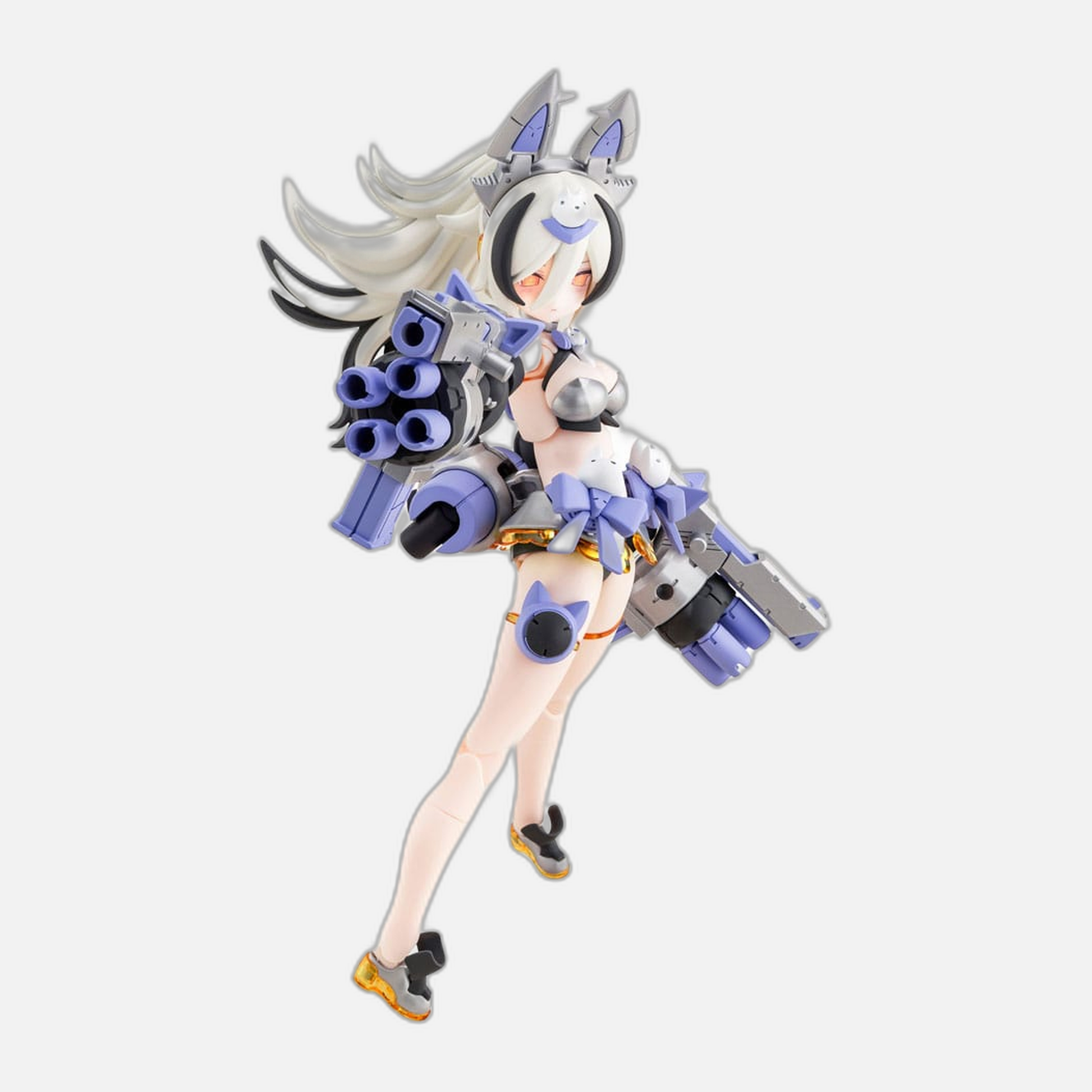 Introducing the Megami Device Plastic Model Kit of PUNI?MOFU GIN LANG, a stunning addition to any collector's lineup, encapsulating the perfect blend of beauty, strength, and intricate craftsmanship. This model stands out not just for its striking silver wolf color scheme, but also for the elegance and poise that it exudes. Designed by the talented illustrator BLADE, the updated visuals are a feast for the eyes, highlighting an exquisite attention to detail that captures the character's charm and character. Each feature is meticulously crafted, showcasing a seamless balance between a Bishoujo-style aesthetic and formidable weaponry.