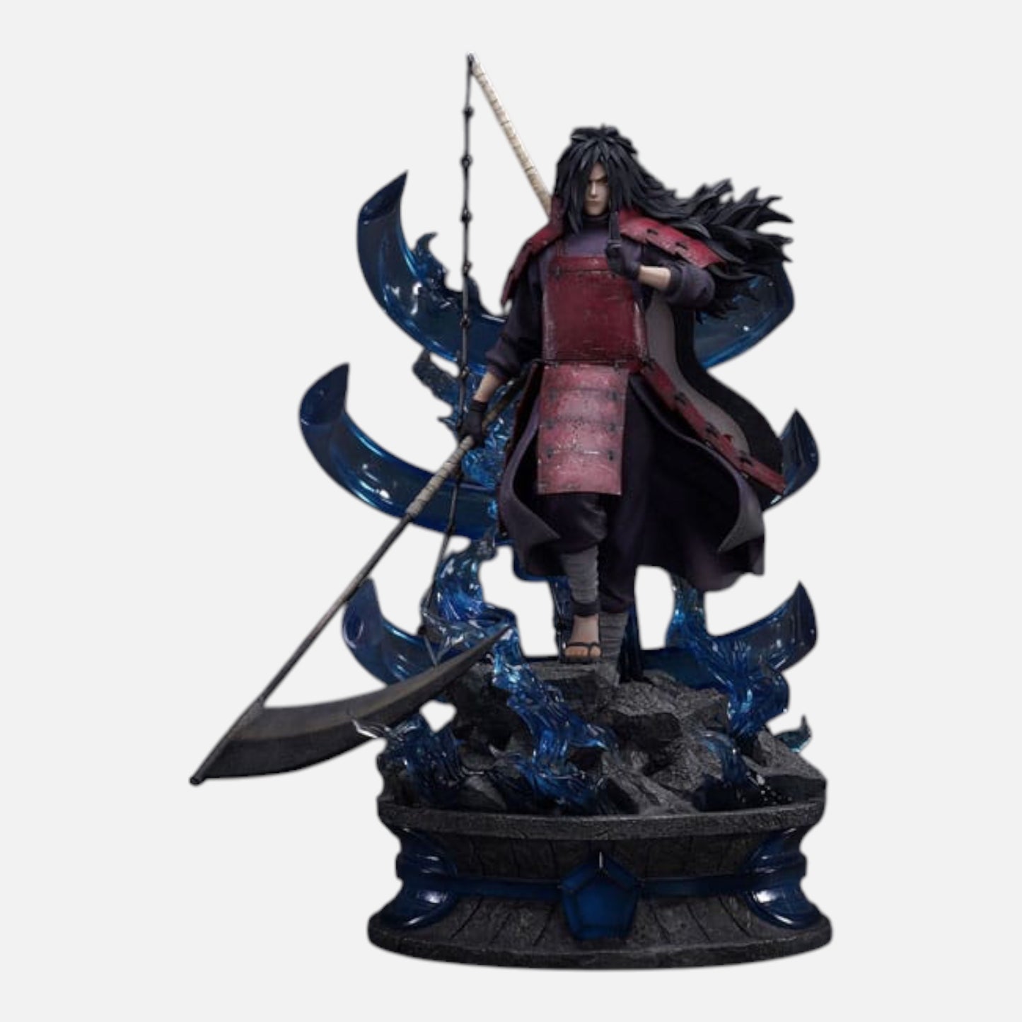 - **Exquisite Detailing:** Madara's iconic crimson armor showcases careful attention to every distressed metal plate, radiating the intensity of countless battles. Beneath this, the Uchiha uniform is rendered with lifelike black fabric textures, highlighting the character's complexity. The long black chain of his sickle, paired with the Gunbai Uchiwa, adds a compelling dynamic to his commanding presence.