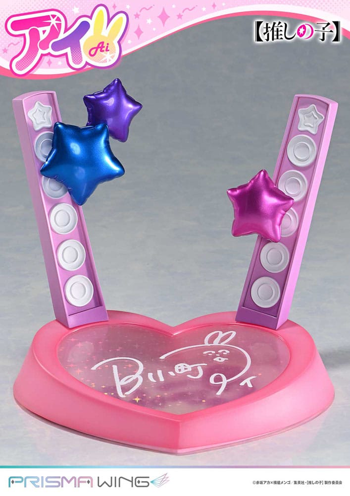 As you place this statue in your collection, you'll feel the vibrant energy of a live performance captured in a single moment. The specially designed pink heart-shaped base, embellished with starry glitter balloons and dynamic twin speakers, amplifies Ai's stage presence and brings her infectious spirit to life. The hologram effect, featuring B-KOMACHI Ai floating above the stage, adds an enchanting touch that draws the eye and captures the imagination. This unique presentation not only enhances the visual appeal but also tells a story, inviting you to relive her unforgettable performances every time you admire the piece.
