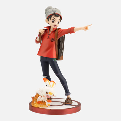 Victor’s dynamic pointing stance and the energetic pose of Scorbunny—complete with fiery accents—bring a sense of movement and adventure to the figurine, making it feel alive with the anticipation of what lies beyond the horizon.