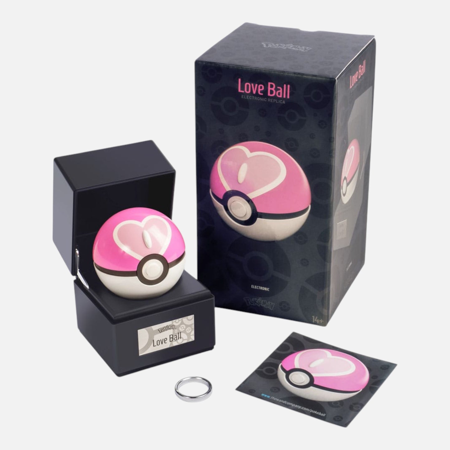 This premium Love Ball replica features a die-cast metal shell with a vibrant, touch-sensitive finish. Housed in a matte black display case with multicolor lighting, it includes a polished stainless steel display ring. Officially licensed and uniquely numbered, it’s a must-have for any Pokémon collector.