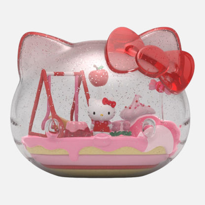 **Dreamy Details:** Towering at approximately 12.9 cm, the diorama features removable components for dynamic display—apple-shaped swings, strawberry-topped lamp posts, and candy clouds all set on a donut-inspired base. The intricate design includes Hello Kitty with that iconic bow among charming dessert accents like puddings and flower-shaped cookies.