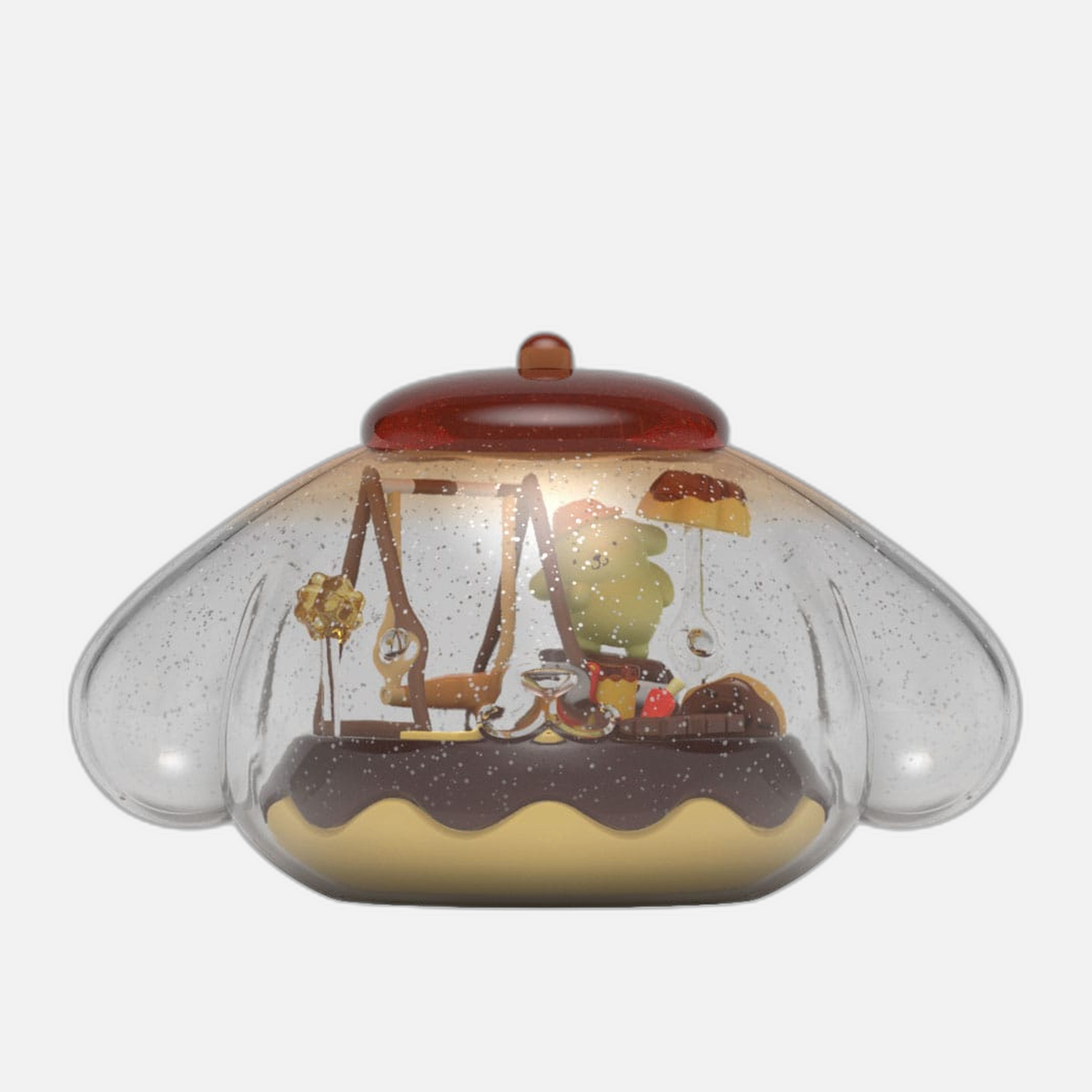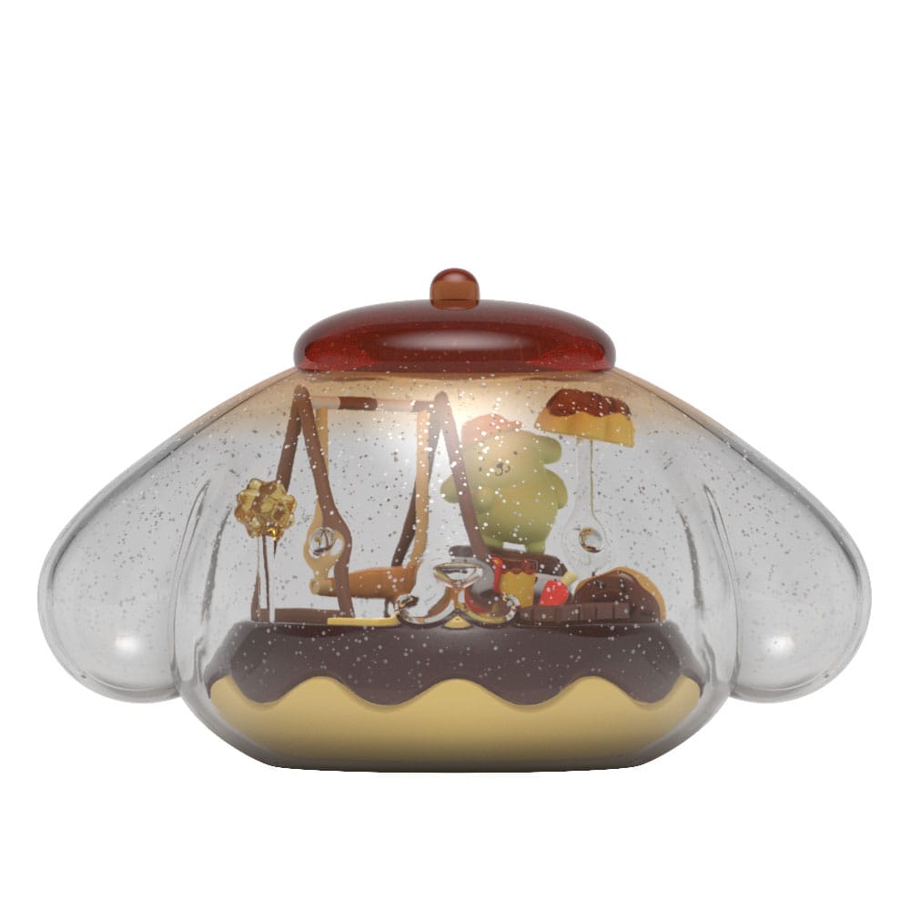The artistry of this Pompompurin mini-figure is truly a feast for the eyes. Standing proudly within the sparkling dome, Pompompurin is seated on a chocolate swing, surrounded by delightful dessert-themed elements that ignite the senses. The meticulous details—a whimsical custard lamp post, a charming chocolate biscuit bench, and a tray overflowing with delectable treats—transform this piece into a miniature wonderland. The donut-shaped base, dripping with luscious chocolate glaze, adds a rich, inviting aesthetic that makes it impossible to resist. Each element is crafted with precision, ensuring that every glance brings out the playful spirit of Kandyland.