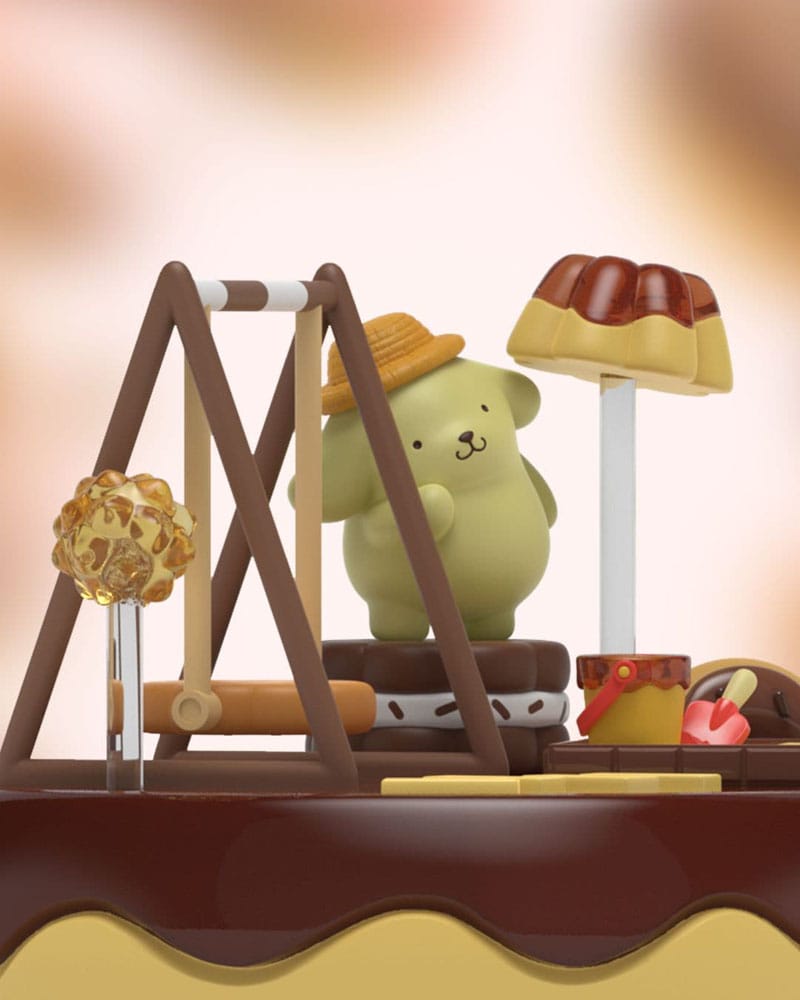 Perched on a charming chocolate swing, Pompompurin is surrounded by a feast of dessert-themed elements, from custard lamp posts to a tray of irresistible treats.